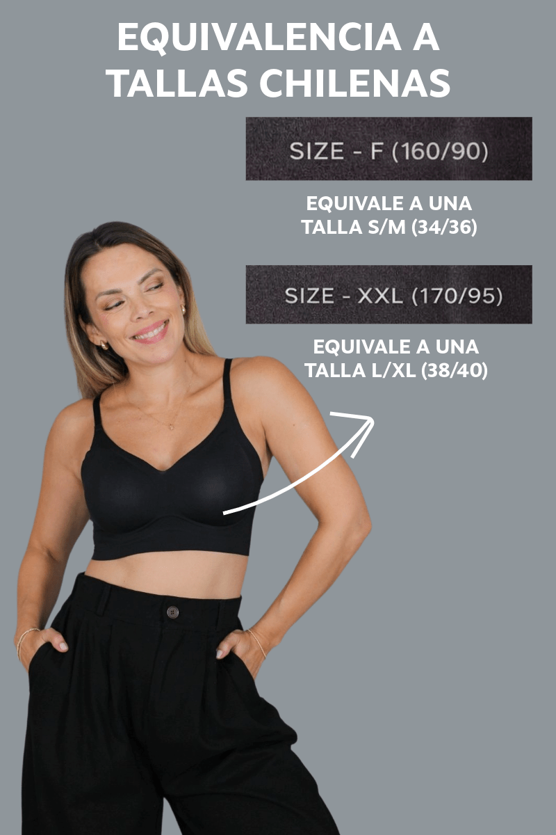 (L/XL) Sirve hasta una copa 40C (si te mides bajo el busto y tienes hasta 95 cm y justo en la parte más pronunciada del busto hasta 110 cm)