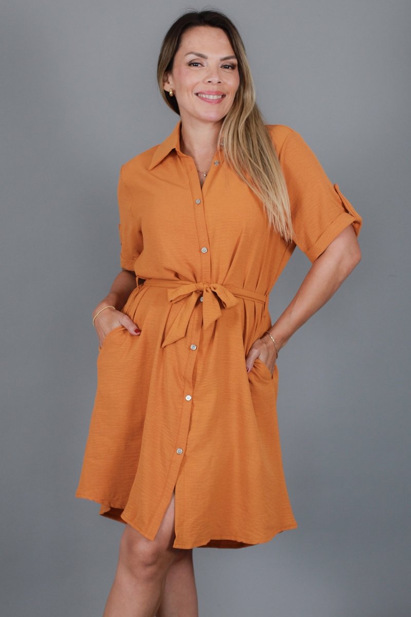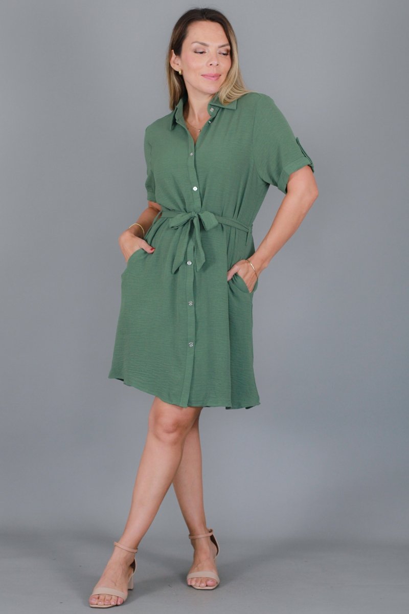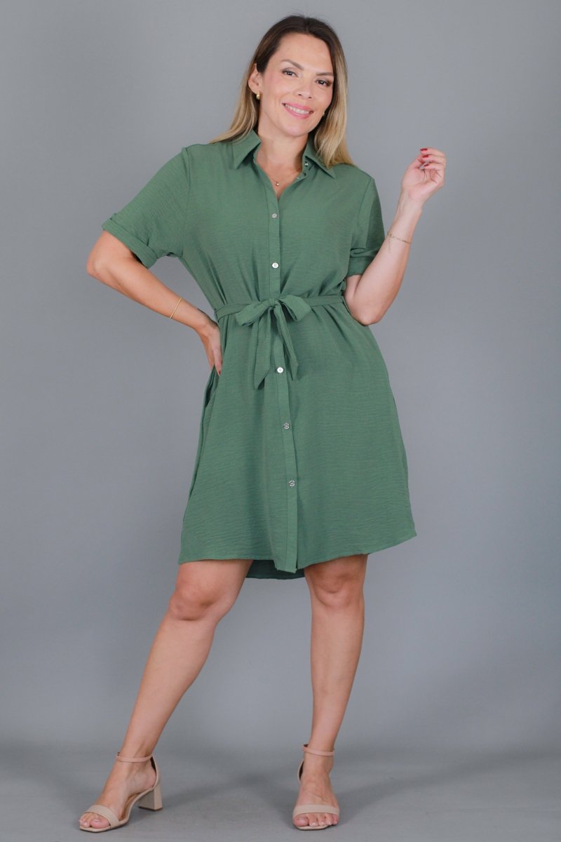 Lo mejor es su lazo ajustable en la cintura, que te permite adaptarlo perfectamente a tu cuerpo resaltando tu silueta de forma natural. Sus manguitas cortas con detalle de botón y la tela liviana lo hacen ideal para mantenerte fresca y cómoda, ya sea en la oficina o en un paseo de fin de semana. Tiene bolsillos y es del largo perfecto.