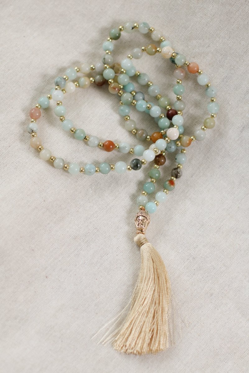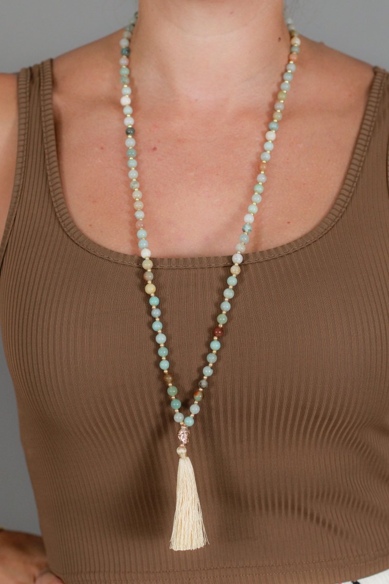 Collar con cuentas en tonos celestes y café y colgante de buda y borla de hilo