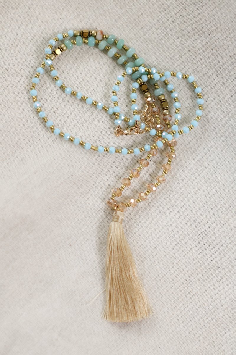 Collar con cuentas en tonos turquesa y beige y colgante de borla